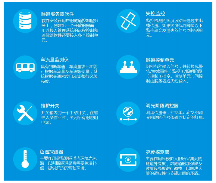 ? 動(dòng)態(tài)照明:根據(jù)采集洞內(nèi)外的光照度及車(chē)流量、車(chē)速等數(shù)據(jù),制定高效照明方案。有效解決隧道常見(jiàn)的白洞和黑洞效應(yīng),節(jié)約電能;同時(shí)通過(guò)燈具輪休,還有效延長(zhǎng)燈具使用壽命。