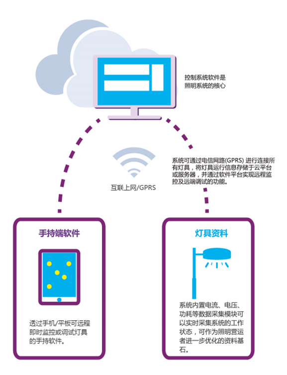 智能道路照明系統(tǒng),集成了專業(yè)高效的智能照明燈具、數(shù)據(jù)通訊、動(dòng)態(tài)控制設(shè)備和監(jiān)控中心的無(wú)線互聯(lián),實(shí)現(xiàn)了“遙控”、“遙測(cè)”、“遙信”、“遙調(diào)”的燈聯(lián)網(wǎng)“四遙”功能。使得城市照明的管理更節(jié)能、高效、人性化。