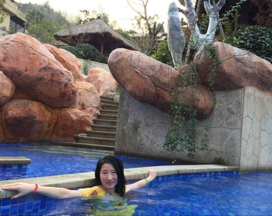 下午組織泡溫泉。環(huán)境優(yōu)美,清澈舒適的溫泉讓我們倍感神清氣爽。溫泉里90后的郁美女她笑容可掬的樣子,我想她的心中一定像身后的一池清水一樣,也是寧靜一片。