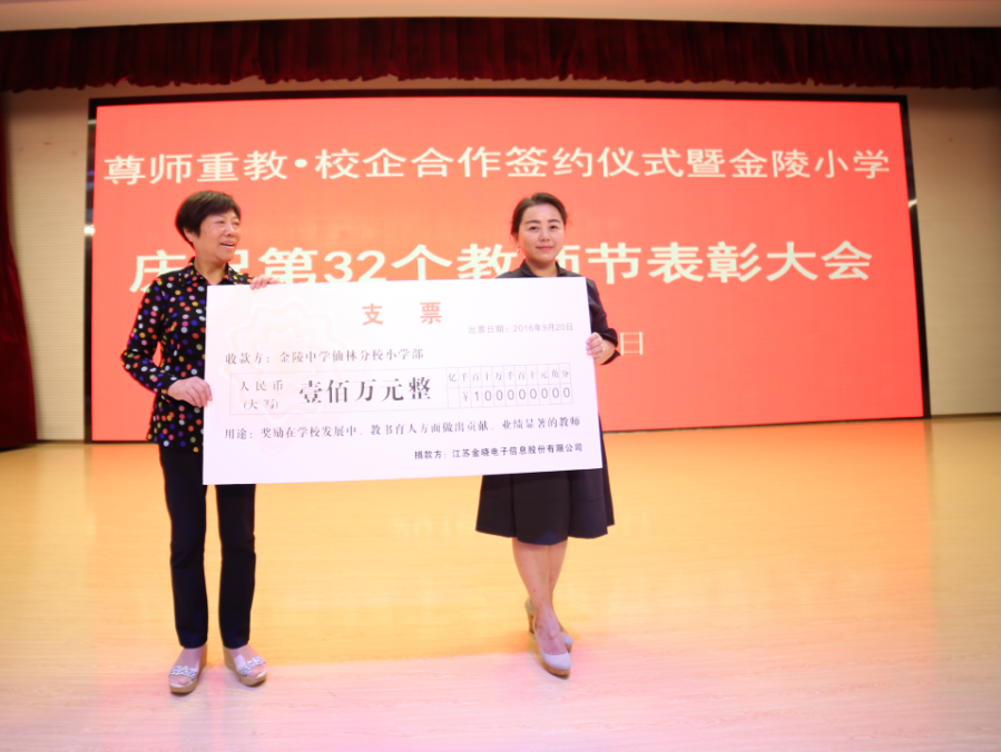 金曉電子董事長陳紅梅與金陵中學(xué)仙林分校小學(xué)部校長林慧敏在會(huì)上正式簽訂助教合作協(xié)議。林校長在會(huì)上致辭,并表達(dá)了對金曉電子熱忱資助的由衷感謝,她強(qiáng)調(diào)本次校企合作,既在社會(huì)上宣揚(yáng)了“尊師重教”的美德,也體現(xiàn)了金曉作為優(yōu)秀企業(yè)回饋社會(huì)的高尚情懷。接著,林校長給江蘇金曉電子信息股份有限公司陳紅梅董事長頒發(fā)名譽(yù)校長證書。