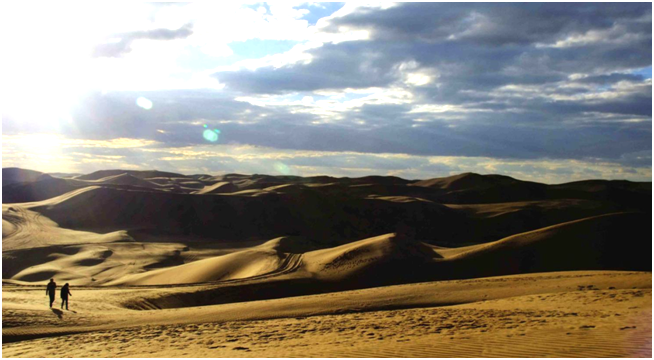 廣袤的大漠,死寂的沙海,雄渾而靜穆,浩大無邊的虛無令人窒息和恐懼,永遠是灼熱的黃色,仿佛大自然在這里把洶涌的波濤、排空的怒浪,剎那間凝固了起來,讓它永遠靜止不動。