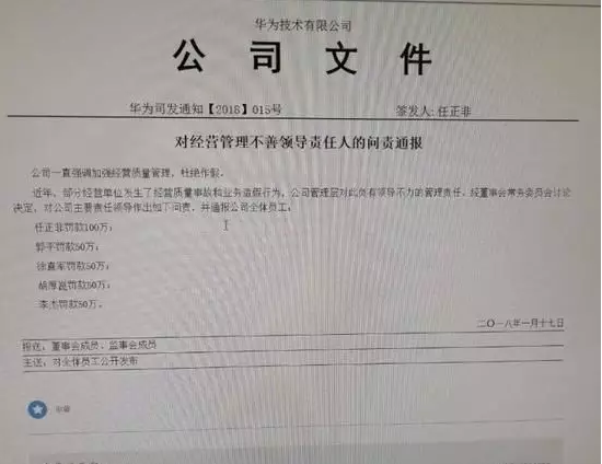 17日晚,華為下發(fā)了一份通報(bào),稱因經(jīng)營質(zhì)量事故和業(yè)務(wù)造假,對主要責(zé)任領(lǐng)導(dǎo)作出問責(zé):任正非罰款100萬;郭平罰款50萬;徐直軍罰款50萬;胡厚崑罰款50萬;李杰罰款50萬。