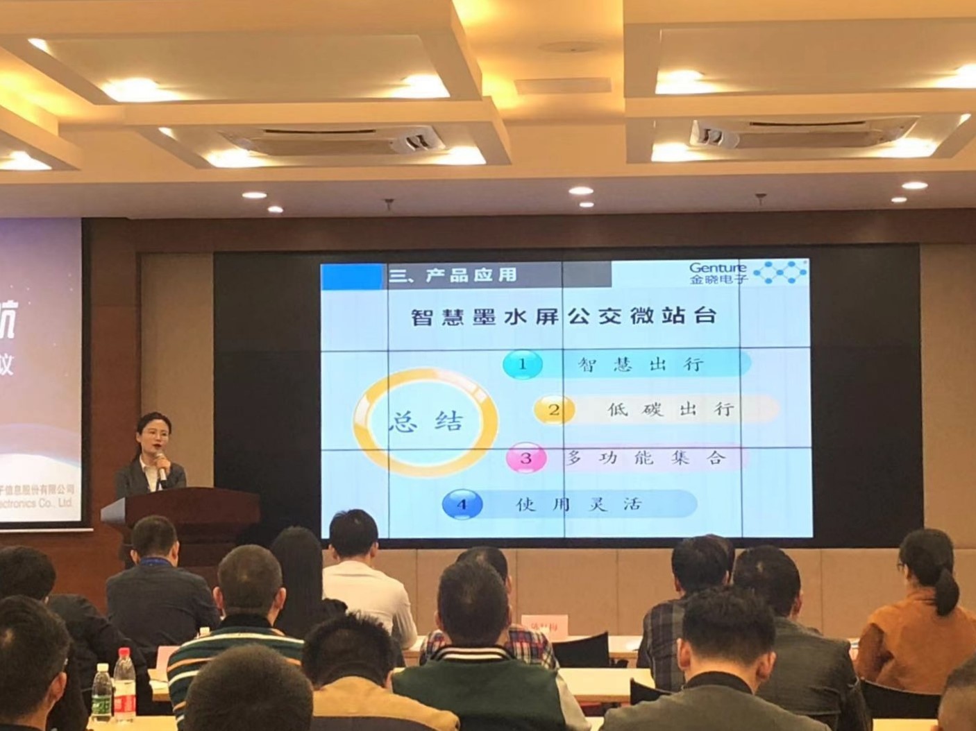 然后,各產(chǎn)品研發(fā)負(fù)責(zé)人用PPT演示加產(chǎn)品展示的方式為大家介紹了14款新產(chǎn)品。有公交領(lǐng)域的“智慧墨水屏公交微站臺(tái)”、“載波型公交車載LED顯示終端”、“智能電子公交站牌”;有為無人駕駛服務(wù)的“路側(cè)終端系統(tǒng)”和ADAS核心部件“毫米波防撞系統(tǒng)”;有外觀設(shè)計(jì)的“情報(bào)板工業(yè)設(shè)計(jì)”類產(chǎn)品,設(shè)計(jì)師們夜以繼日地創(chuàng)意和構(gòu)思,將藝術(shù)創(chuàng)想與實(shí)際需求相結(jié)合,經(jīng)過多次的方案論證和生產(chǎn)工藝的革新,從而改變了公司以前不重視產(chǎn)品外觀設(shè)計(jì)的習(xí)慣。本次會(huì)議還展示了“智能路側(cè)終端+聯(lián)網(wǎng)平臺(tái)+大數(shù)據(jù)發(fā)布平臺(tái)”這一面向不同需求和不同應(yīng)用場(chǎng)景的解決方案。金曉電子始終致力智能交通創(chuàng)新發(fā)展。