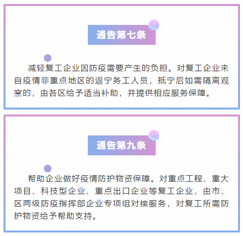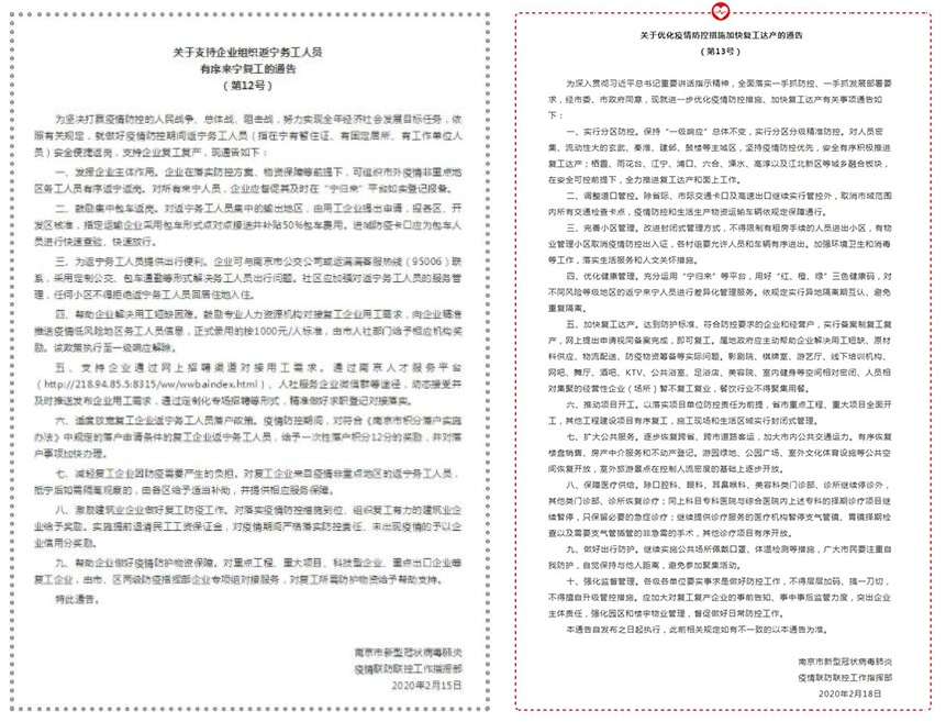 2月15日和18日,我市先后發(fā)布《關(guān)于支持企業(yè)組織返寧務(wù)工人員有序來寧復(fù)工的通告》和《關(guān)于優(yōu)化疫情防控措施加快復(fù)工達產(chǎn)的通告》兩個文件,及時回應(yīng)了疫情防控期間企業(yè)復(fù)工最為關(guān)心的用工短缺、職工返崗、防疫保障等困難。