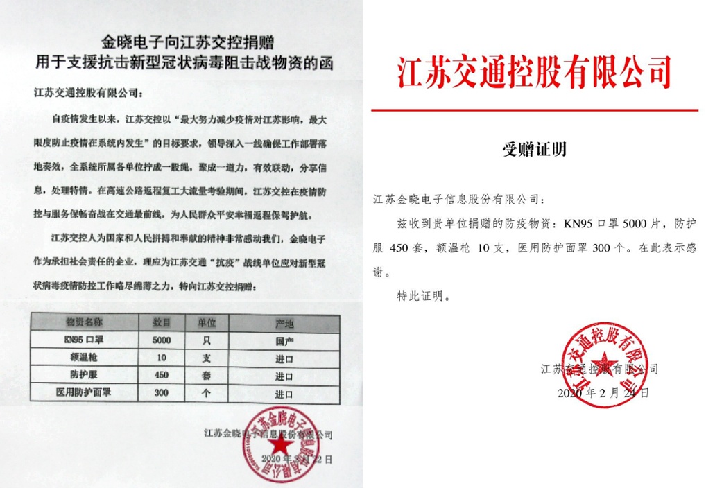 當(dāng)前,新冠肺炎疫情防控形勢依然嚴(yán)峻,江蘇交控為國家和人民拼搏奉獻(xiàn)的精神非常令人感動。金曉電子作為大交通行業(yè)的一員,不忘初心,積極承擔(dān)起社會責(zé)任,以實際行動助力疫情防控工作,通過各種渠道,從美國、韓國、墨西哥等全球各地緊急購買了一批防控物資。金曉集團(tuán)有感于江蘇交控人的奉獻(xiàn)精神,在防控物資到貨后的第一時間,向江蘇交控捐贈,讓這批物資盡快投入到疫情防控使用當(dāng)中,為江蘇交控的抗冠工作略盡綿薄之力。