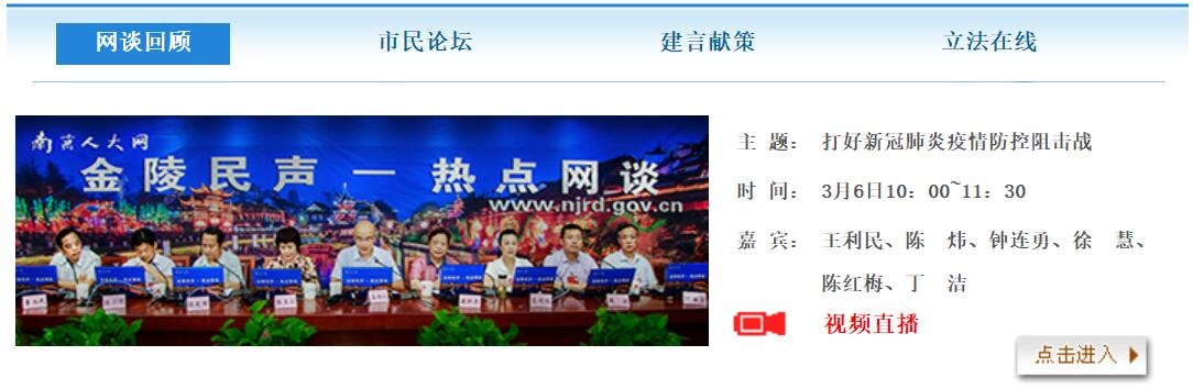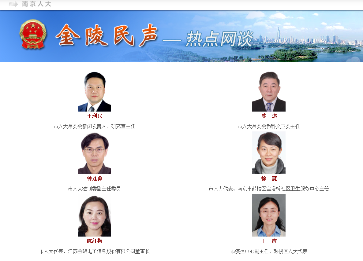 3月6日上午,南京人大網(wǎng)"金陵民聲--熱點網(wǎng)談"欄目第四十九期開播,欄目組專門邀請了2位市人大代表、1位市疾控中心專家以及3位市人大及其常委會相關(guān)工作機構(gòu)負(fù)責(zé)同志作為嘉賓與網(wǎng)友圍繞"打好新冠肺炎疫情防控阻擊戰(zhàn)"話題展開交流。市人大代表、江蘇金曉電子信息股份有限公司董事長陳紅梅受邀參加本期網(wǎng)談。