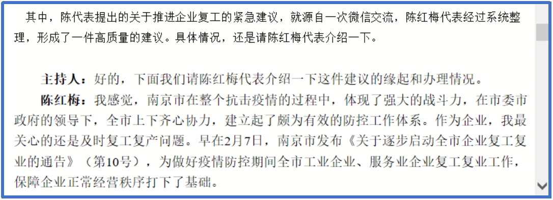 正是由于陳紅梅代表對企業(yè)復(fù)工難的敏銳察覺和為民建言的責(zé)任擔(dān)當(dāng),助推了市政府進(jìn)一步優(yōu)化疫情防控措施、加快復(fù)工達(dá)產(chǎn)的措施出臺。針對建議的辦理情況,陳紅梅代表表示充分的認(rèn)可!