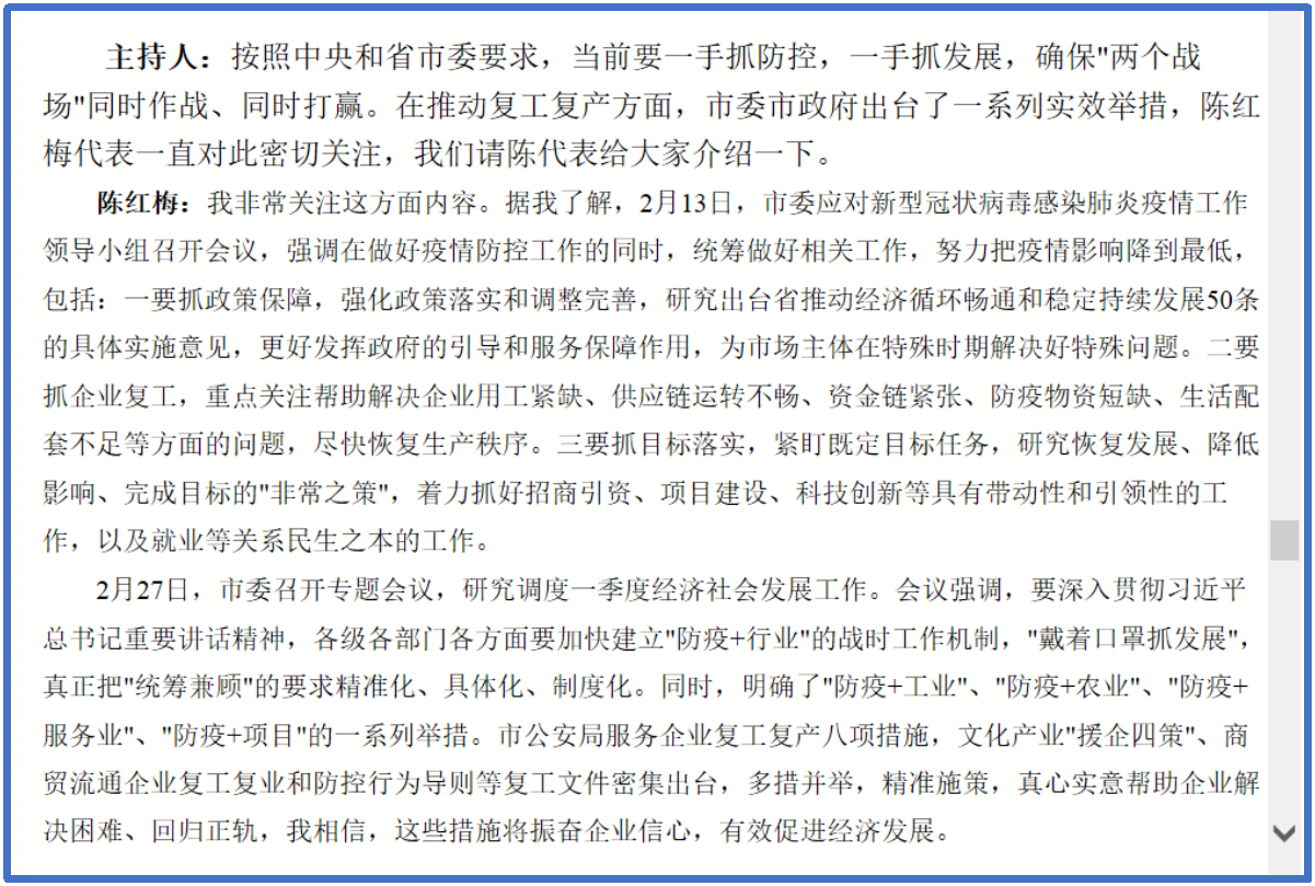 按照中央和省市委要求,當(dāng)前要一手抓防控,一手抓發(fā)展,確保"兩個戰(zhàn)場"同時作戰(zhàn)、同時打贏。在推動復(fù)工復(fù)產(chǎn)方面,市委市政府出臺了一系列實效舉措,陳紅梅代表一直對此密切關(guān)注。