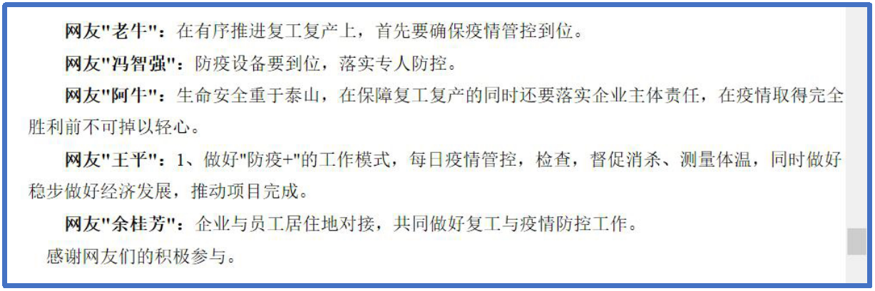 針對如何一手抓好疫情防控,一手抓好發(fā)展經(jīng)濟、復(fù)工復(fù)產(chǎn),網(wǎng)友們也紛紛支招: