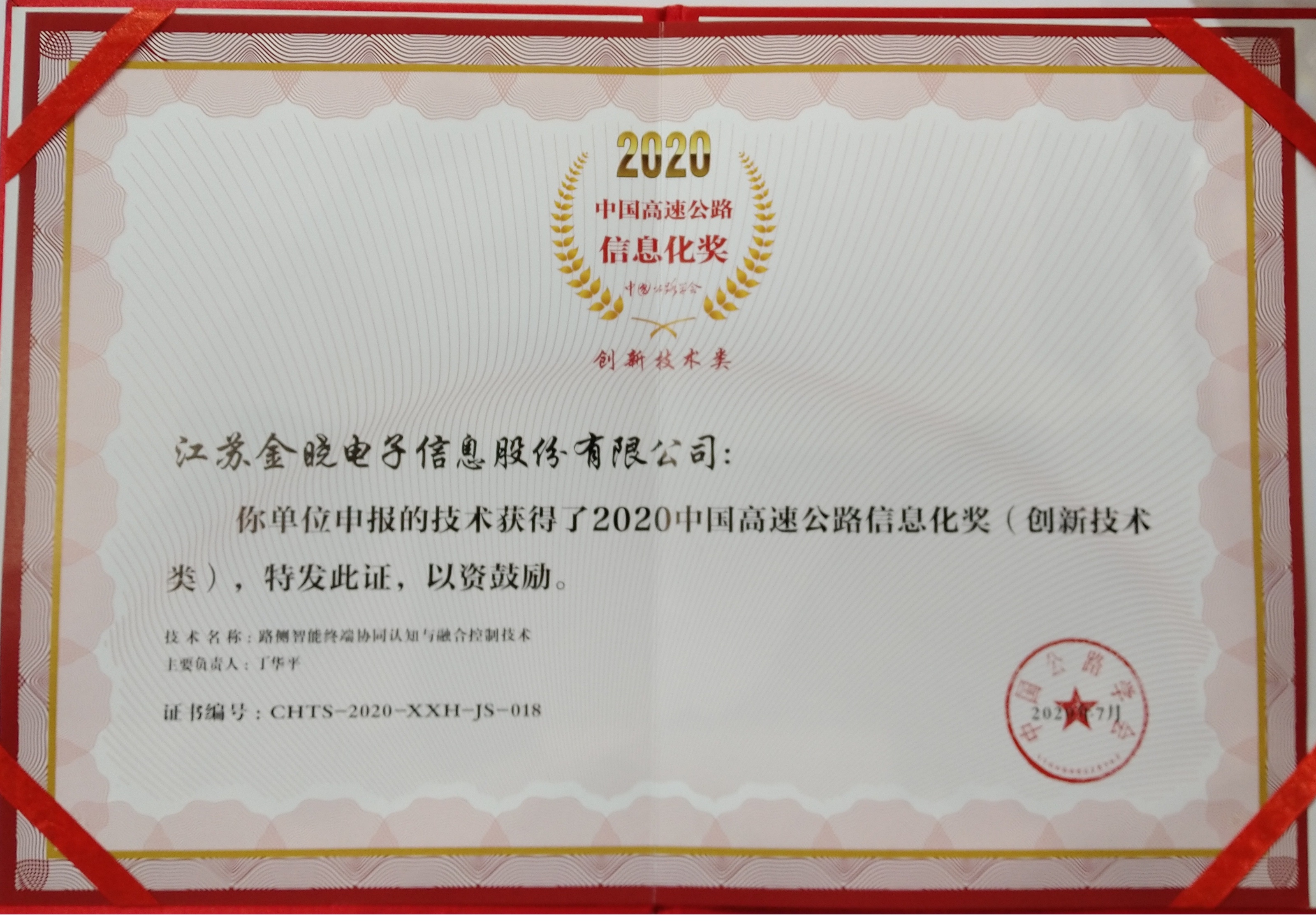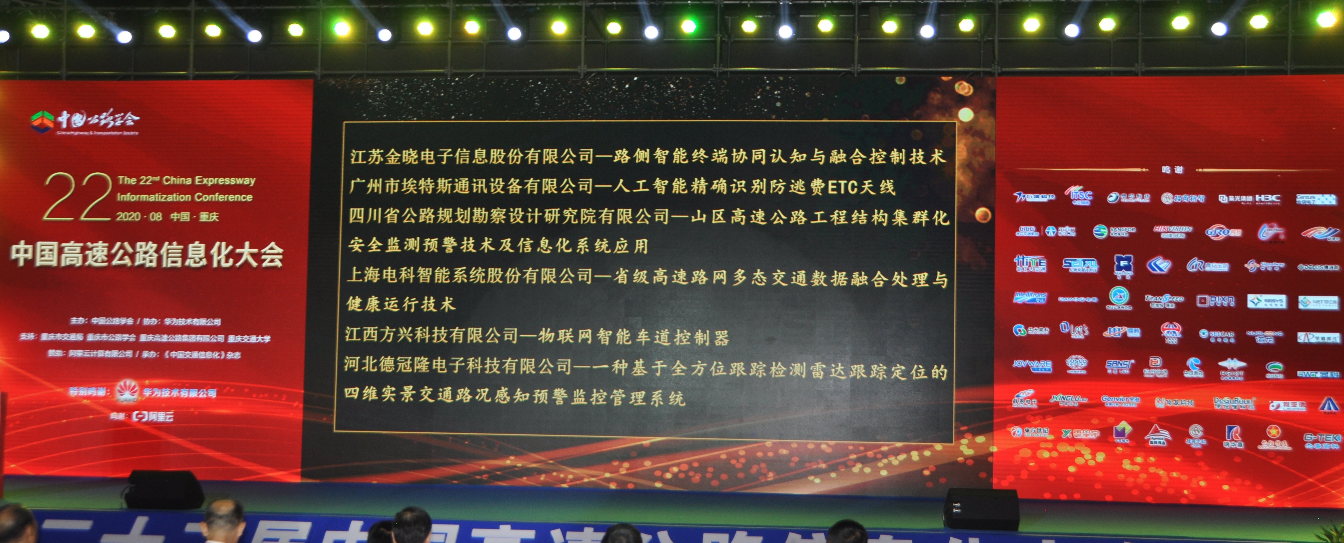 大會開幕式之后舉行了“2020中國高速公路信息化獎”的頒獎儀式,金曉電子的“路側智能終端協(xié)同認知與融合控制技術”獲得“創(chuàng)新技術類”獎項。