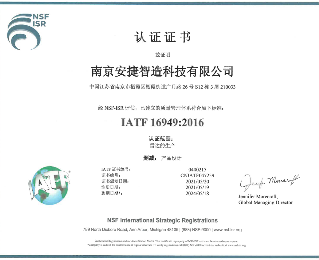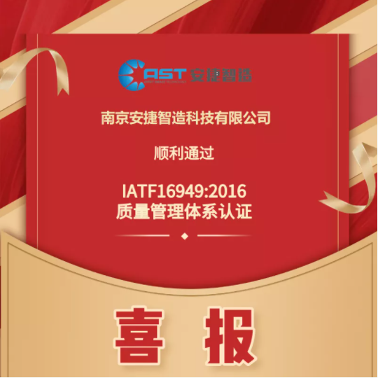 熱烈慶祝南京安捷智造科技有限公司順利通過 IATF16949:2016 質(zhì)量管理體系認(rèn)證