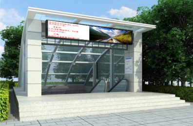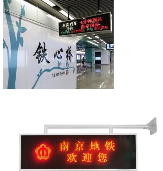 懸掛式顯示屏一般選用LED或LCD顯示屏,吊裝或懸掛安裝于地鐵出入口的上方??梢燥@示地鐵線路名稱、首末班車時(shí)間、地鐵間距、入口編號(hào)、發(fā)布緊急公告、廣告等。
