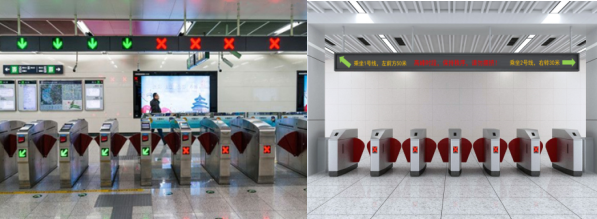 乘客進(jìn)閘口區(qū),吊架安裝LED條屏,引導(dǎo)乘客進(jìn)出閘口,標(biāo)識(shí)醒目。在進(jìn)站/出站客流量大的時(shí)段,可以調(diào)節(jié)進(jìn)口/出口數(shù)量,有效緩解人員排隊(duì)擁堵情況。