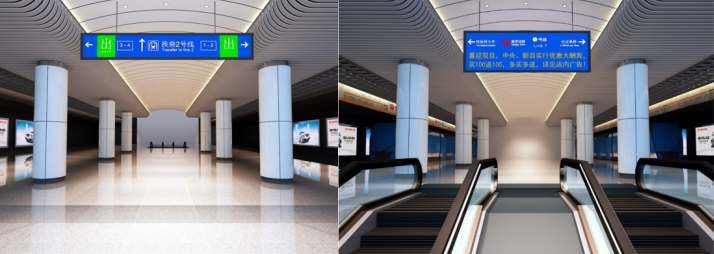 標(biāo)識(shí)屏一般安裝于地鐵換乘通道區(qū)、電梯口和出入口,用于換乘指引、客流信息引導(dǎo)、出入口指示等作用??蛇x用LED、LCD、燈箱。